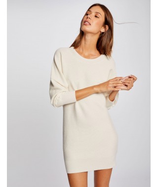 Vestido estilo jersey de punto fino de manga larga con corte recto de color beige. Cuello redondo. Manga abullonada.