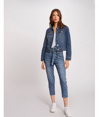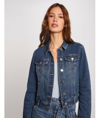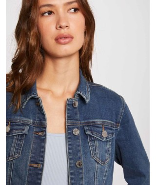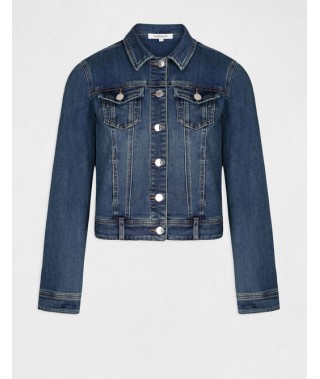 Chaqueta vaquera de manga larga de color azul. Corte recto y corto. Cuello con solapas. Cierre de botones. Dos bolsillos de solapa cerrados por un botón en le pecho, dos bolsillos con ribete en la parte delantera. Trabillas en la cintura. Puño abotonados. Pestañas abotonadas en la cintura. Costuras con contraste.