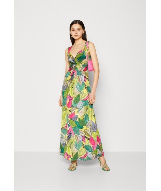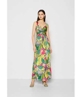 Vestido de tirantes anchos con estampado vegetal color verde. Corte largo. Escote cruzado. Banda ajustada encima de la cintura. Parte inferior holgada.