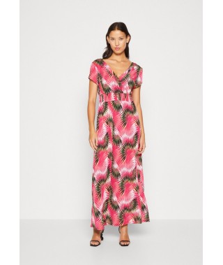 Vestido de manga corta con estampado vegetal color rosa. Corte largo y ajustado. Escote cruzado. Espalda al aire.